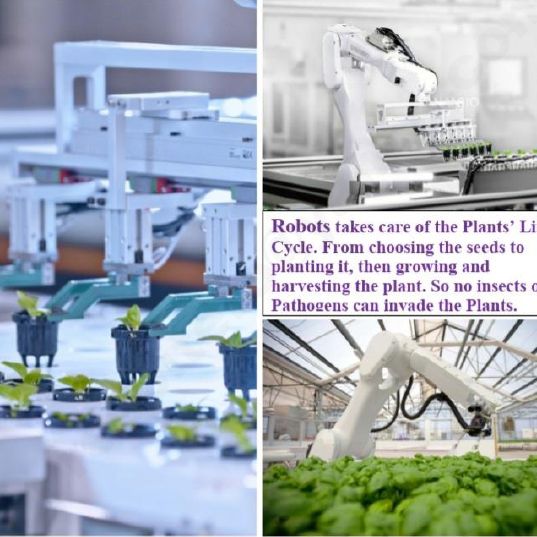 Integrates AI and automated systems for hyper-efficient, soil-free food production, using robots for tasks like seeding, watering, nutrient delivery, and harvesting, all managed by sensors and data to optimize light, climate, and resources, allowing farms to operate in dense urban settings and even supply stores directly, drastically reducing labor and environmental impact.